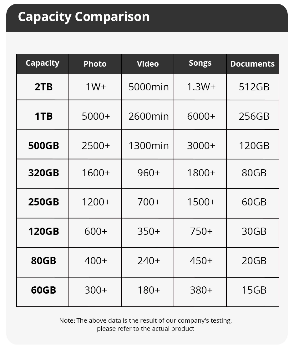 Capacités disponibles : 250 Go, 320 Go, 500 Go, 1 To