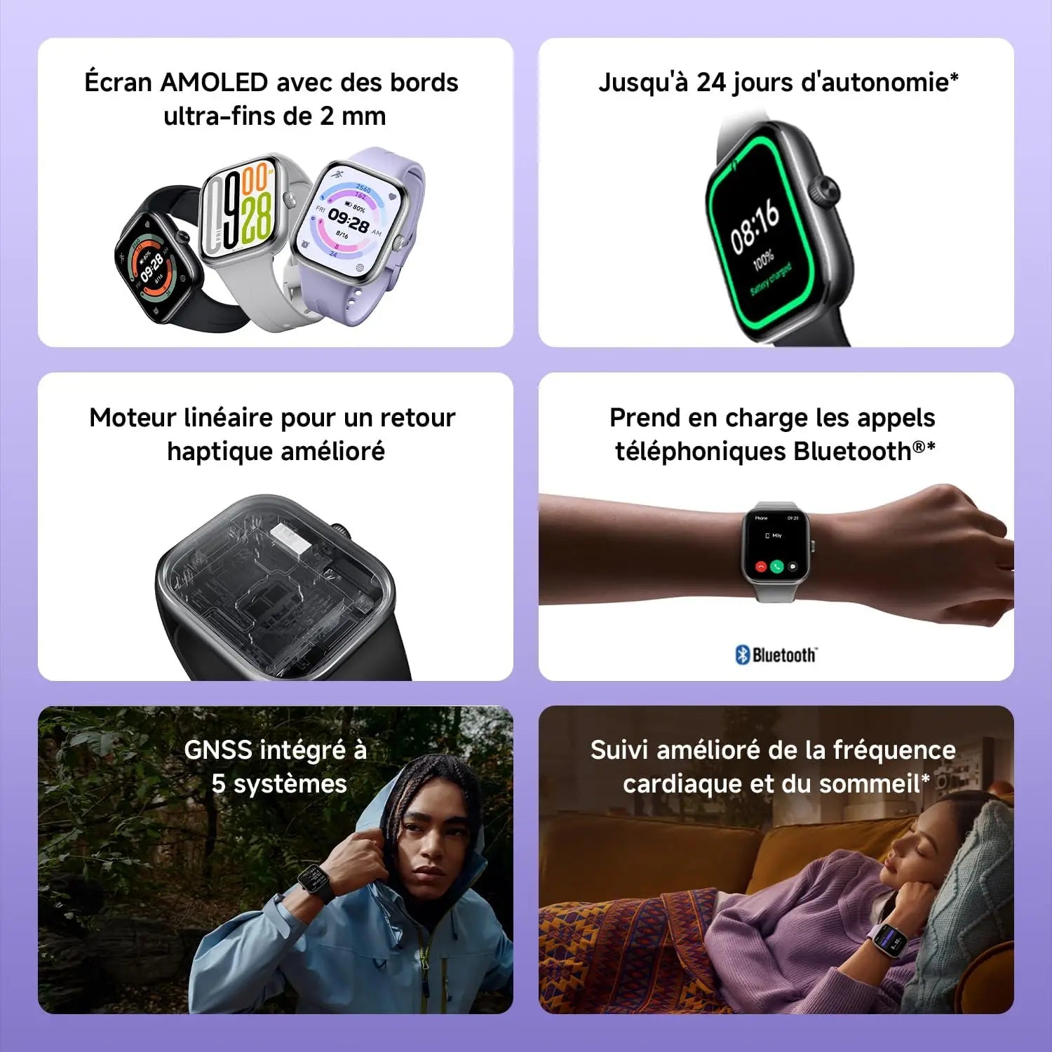 La Xiaomi Redmi Watch 5 Lite combine ultra-connexion et innovation : écran AMOLED géant 1,96" (410×502, PPI 332, ratio 75,6%, always-on), appels Bluetooth avec annulation du bruit et interface complète, GPS GNSS 5 systèmes intégré et autonomie record jusqu’à 18 jours.
